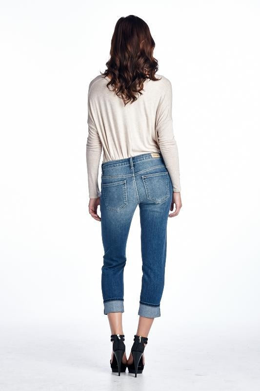 Our stretchy, destroyed boyfriend jean in a dark wash. Whisker detail and faded wash gives this denim a worn in look.