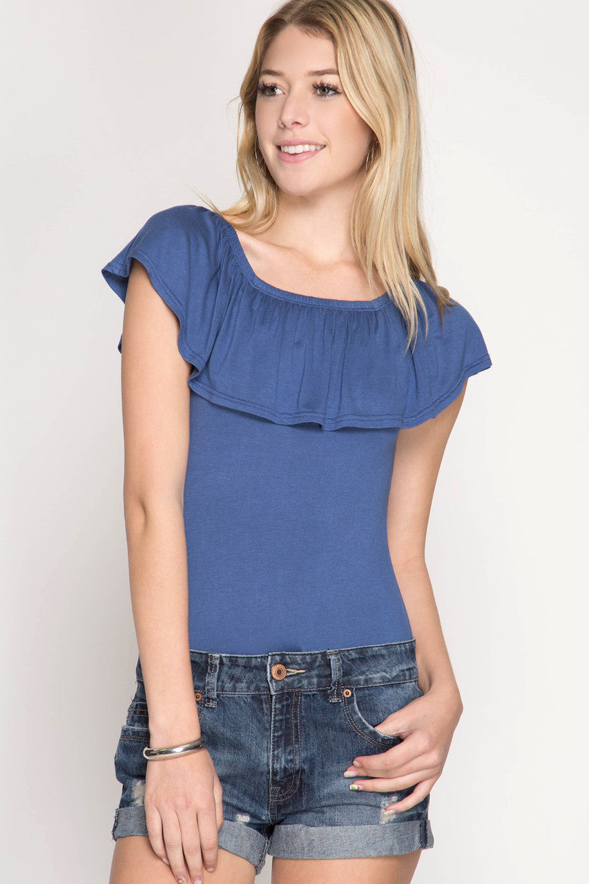 This off-the-shoulder bodysuit features a ruffled detail and is crafted from a soft blend of 60% cotton and 40% rayon knit, combining comfort with style.